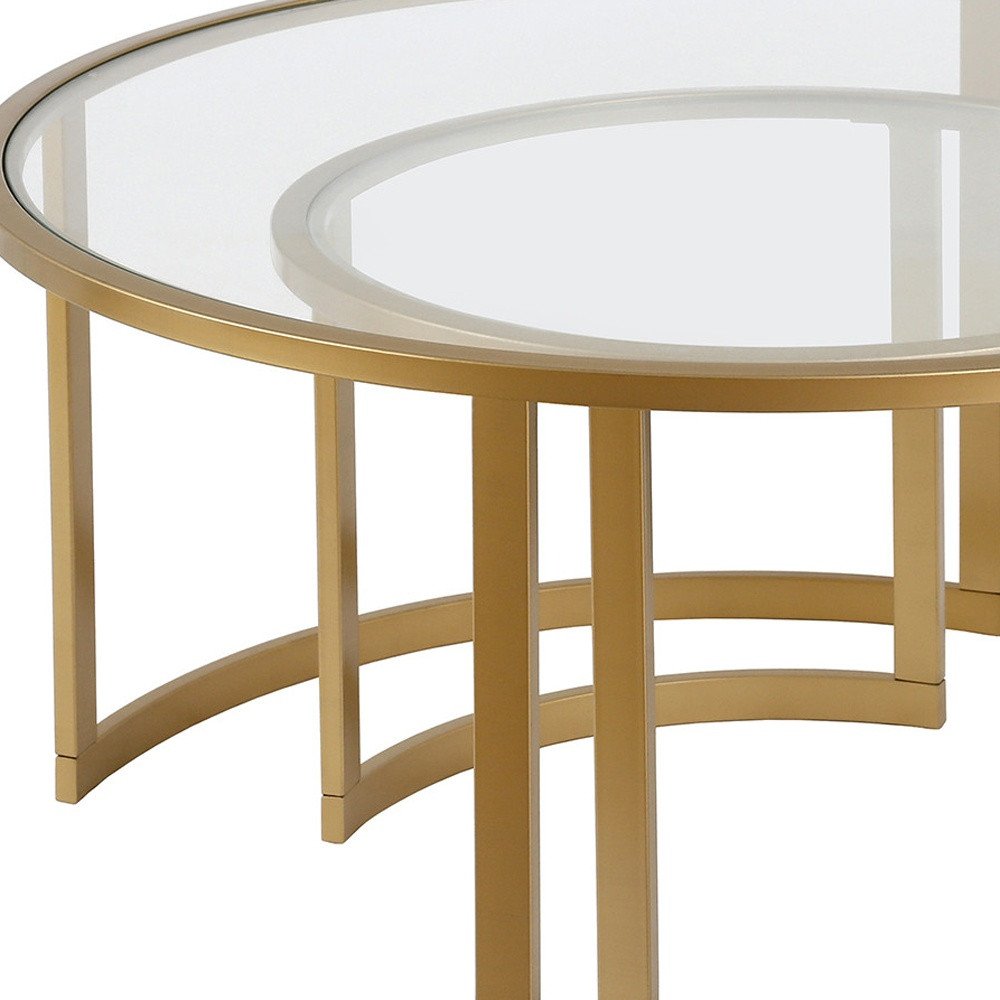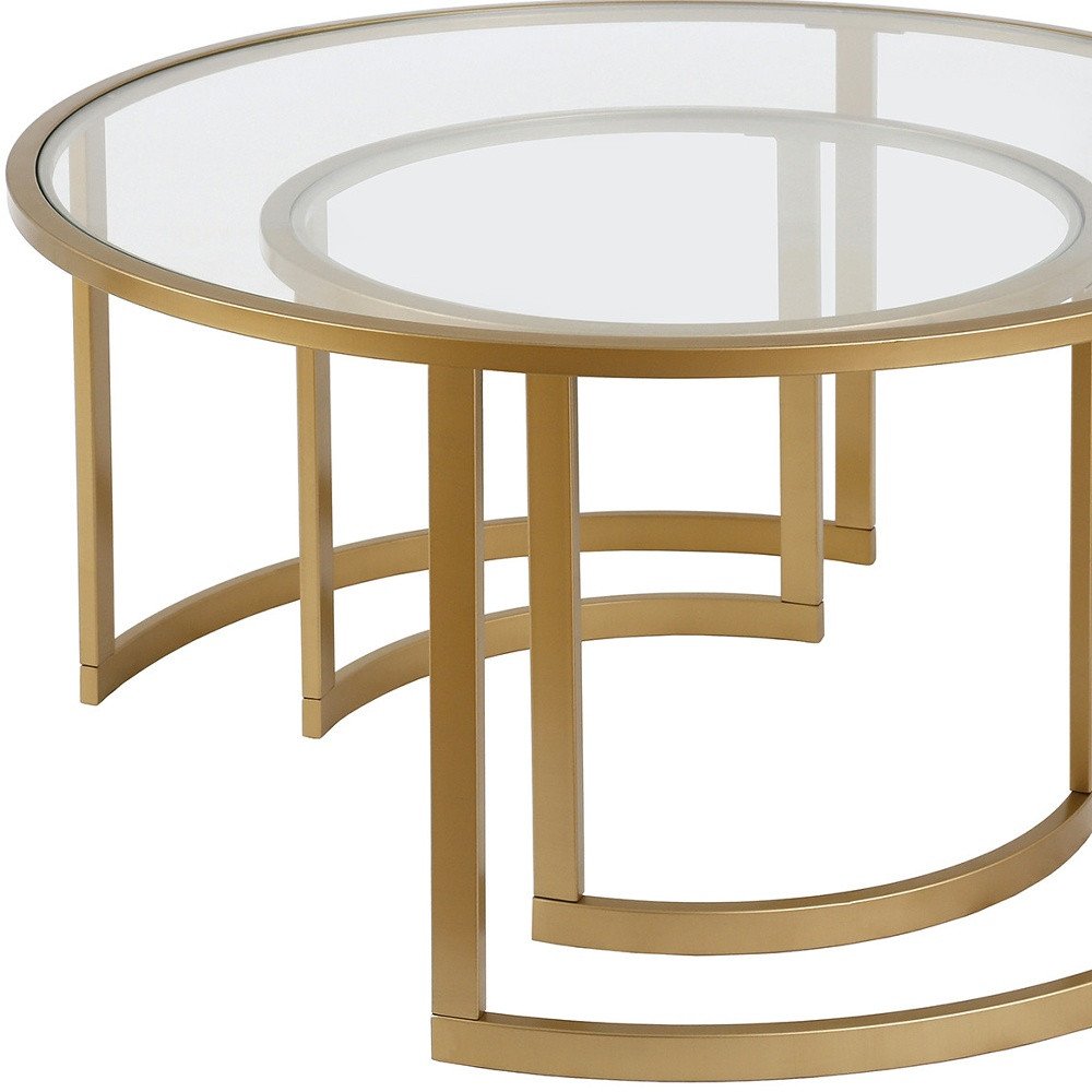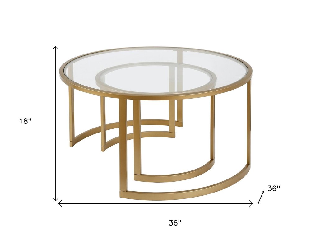 Set of Two Gold Glass And Steel Round Sled Nested Coffee Tables is backordered and will ship as soon as it is back in stock.