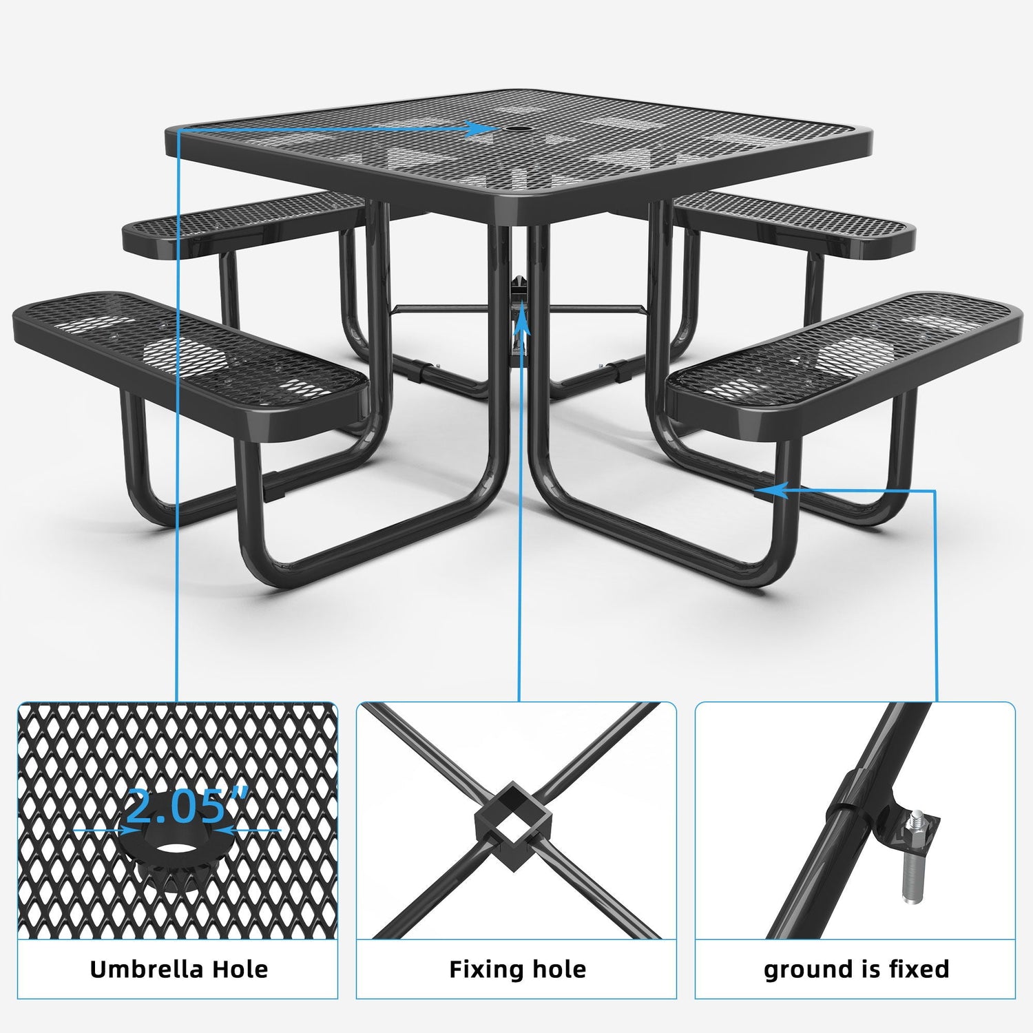 Square Outdoor Steel Picnic Table With Umbrella Pole - Black