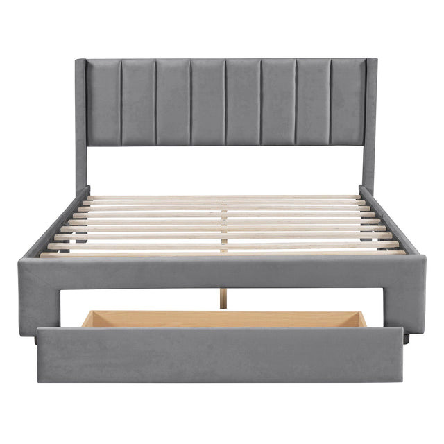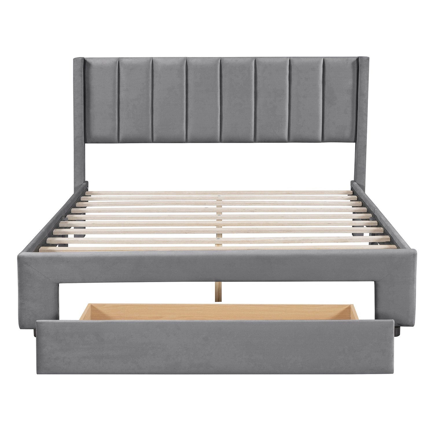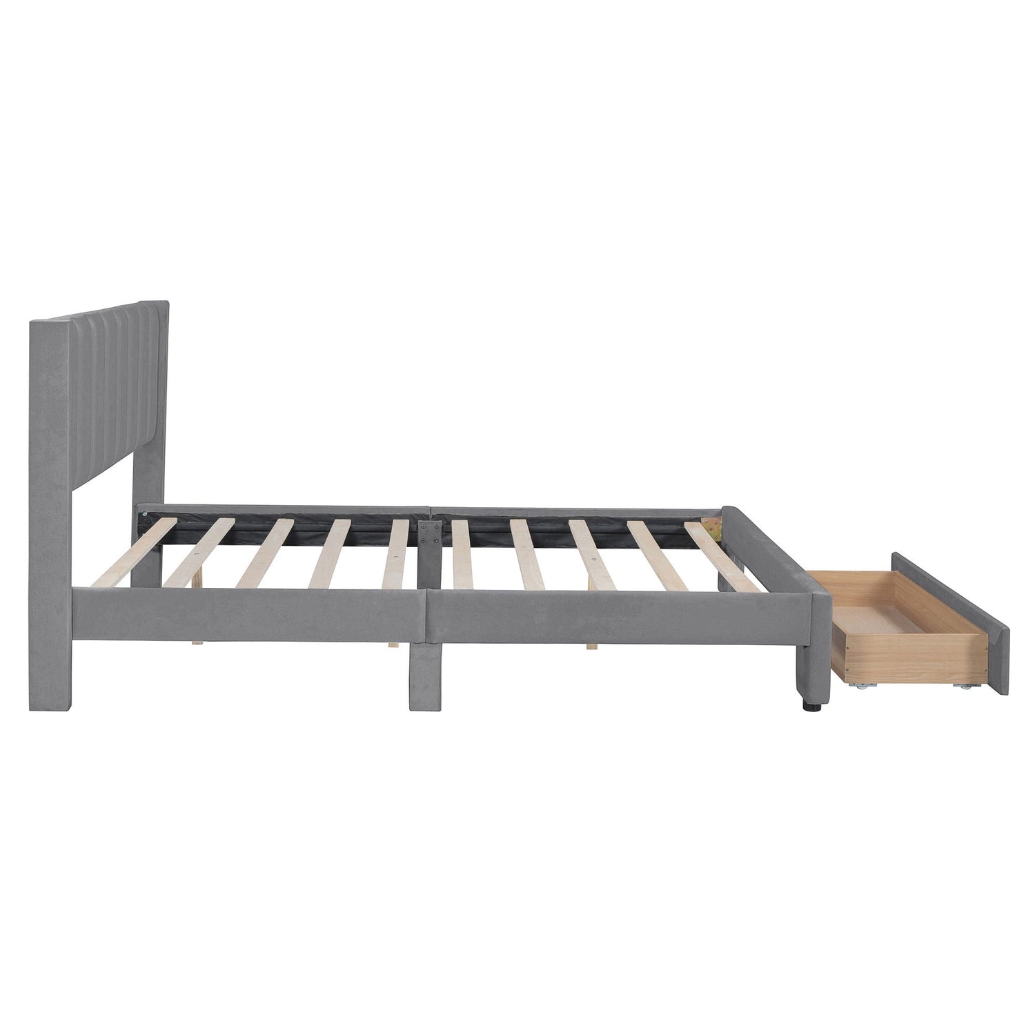 Queen Size Platform Contemporary Upholstered Bed With Storage Drawer - Gray