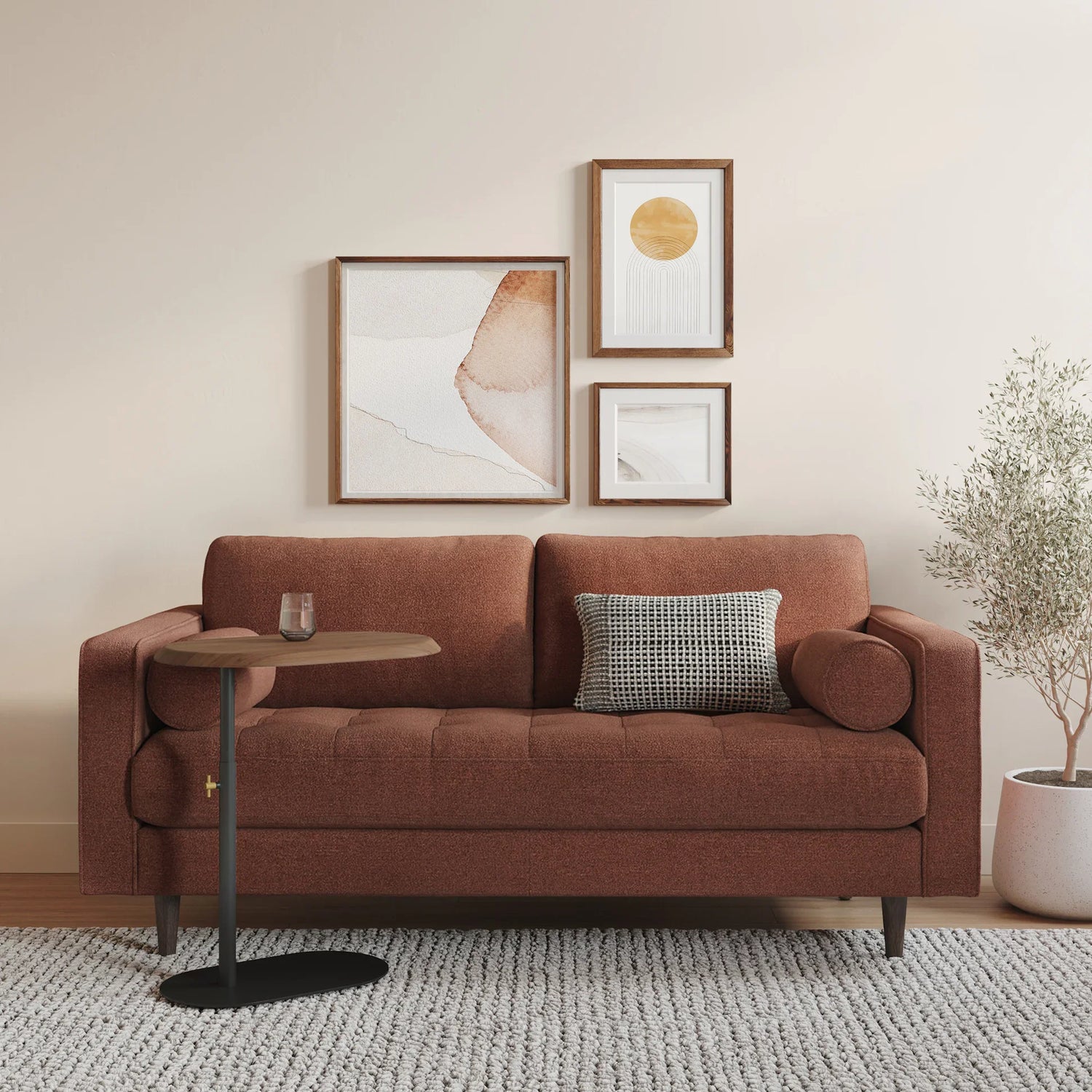 Transform your space with the Sven 72" Tufted Loveseat, a modern adaptation of a mid-century classic, designed for compact living. Featuring clean lines, a tufted bench seat, and plush back cushions, this loveseat is both stylish and comfortable. The Ratine Oxide upholstery is crafted from 100% polyester, making it durable and resistant to stains. This loveseat includes two matching bolster pillows and stands on a solid wood frame, offering superior durability with a Martindale rating of 50,000 rubs, ensuring long-lasting use. Its compact size is perfect for apartments, while the walnut wood-stain legs add a touch of elegance to any decor. Enjoy the best in style and comfort with the Sven Loveseat, complete with a 30-day satisfaction guarantee.