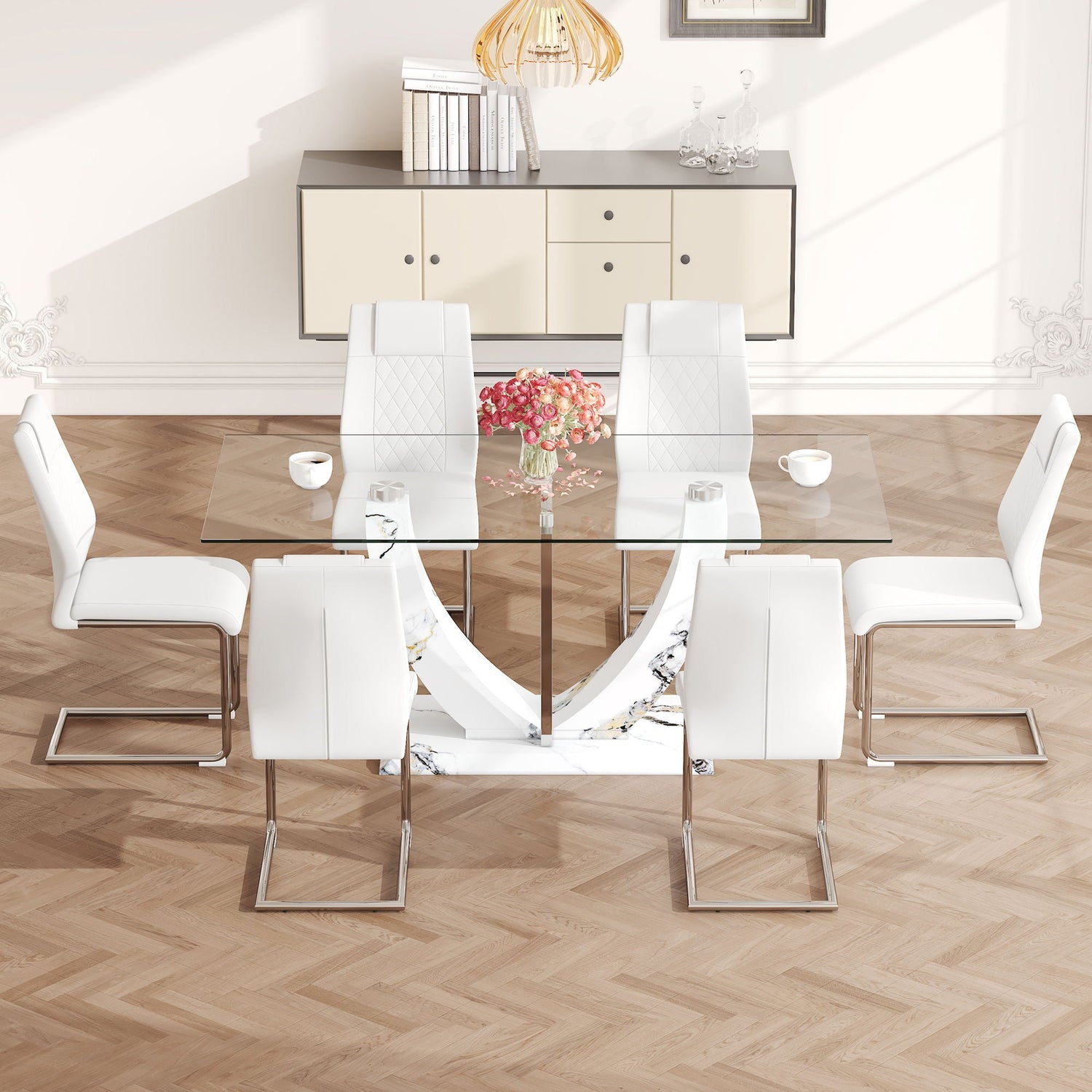 Table And Chair Set, Large Modern Rectangular Glass Table, Can Accommodate 6-8 People, Equipped With A 0.39" Tempered Glass Tabletop And MDF Table Legs.Paired With Comfortable And Soft Chairs - White / Pearl Silver by Couch.com