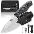 - ✅ ENJOY NATURE IN MAX SAFETY: Set off camping, hiking, hunting or fishing with a premium survival knife including a Kydex Sheath with leather strap, Flint Rod with G10 handle, G 10 Scraper, Paracord and Allen Wrench.