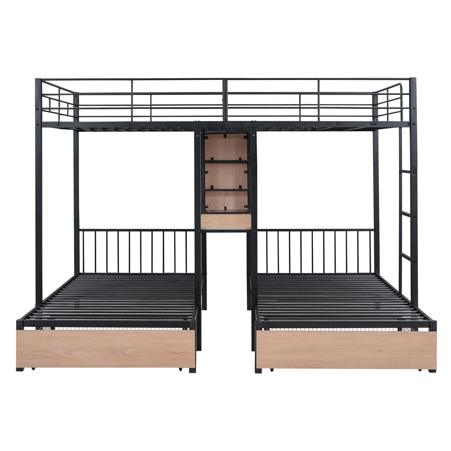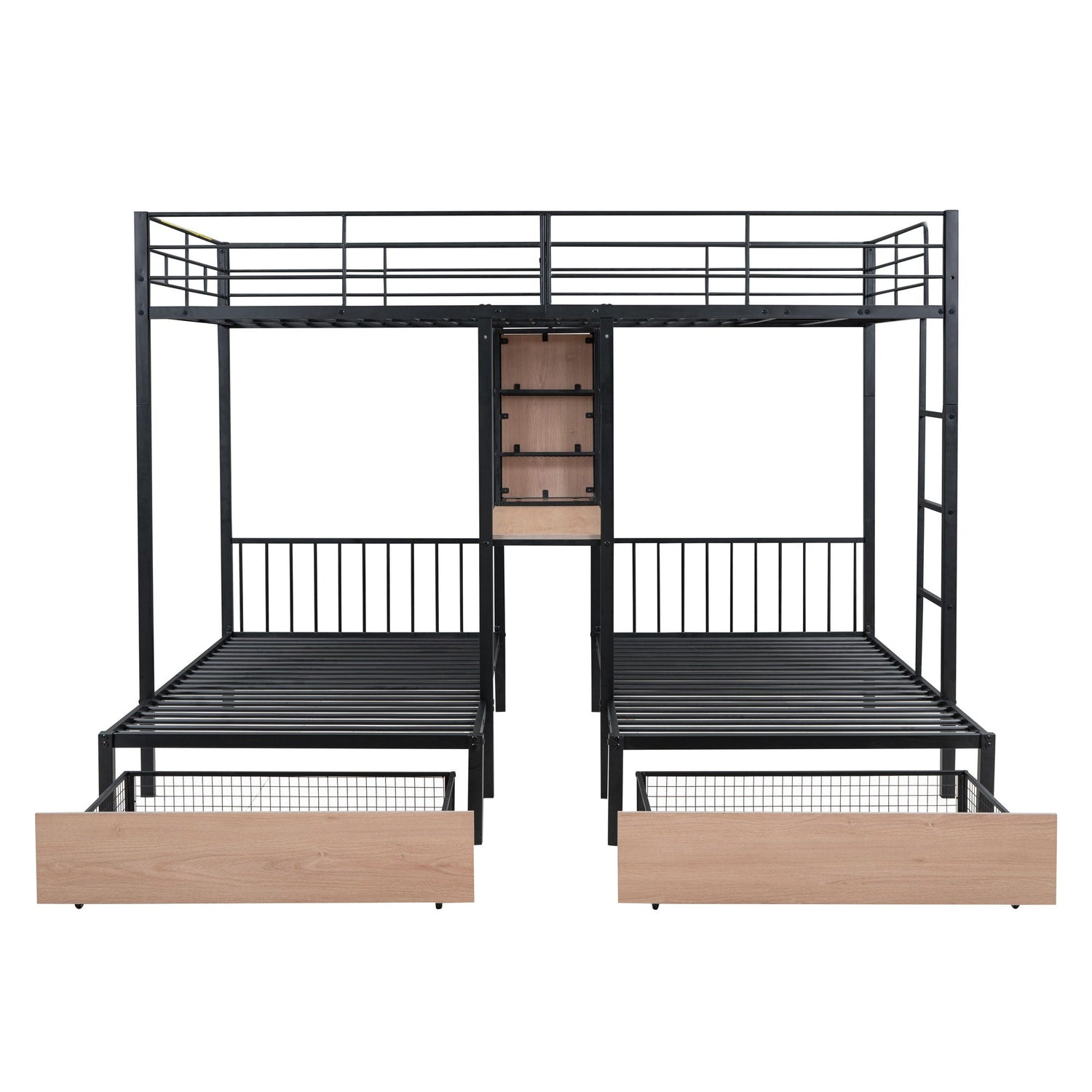 Triple Bunk Bed With Drawers, Multi-Functional Frame With Desks And Shelves In The Middle by Couch.com - Black / Full / Twin over Full is backordered and will ship as soon as it is back in stock.