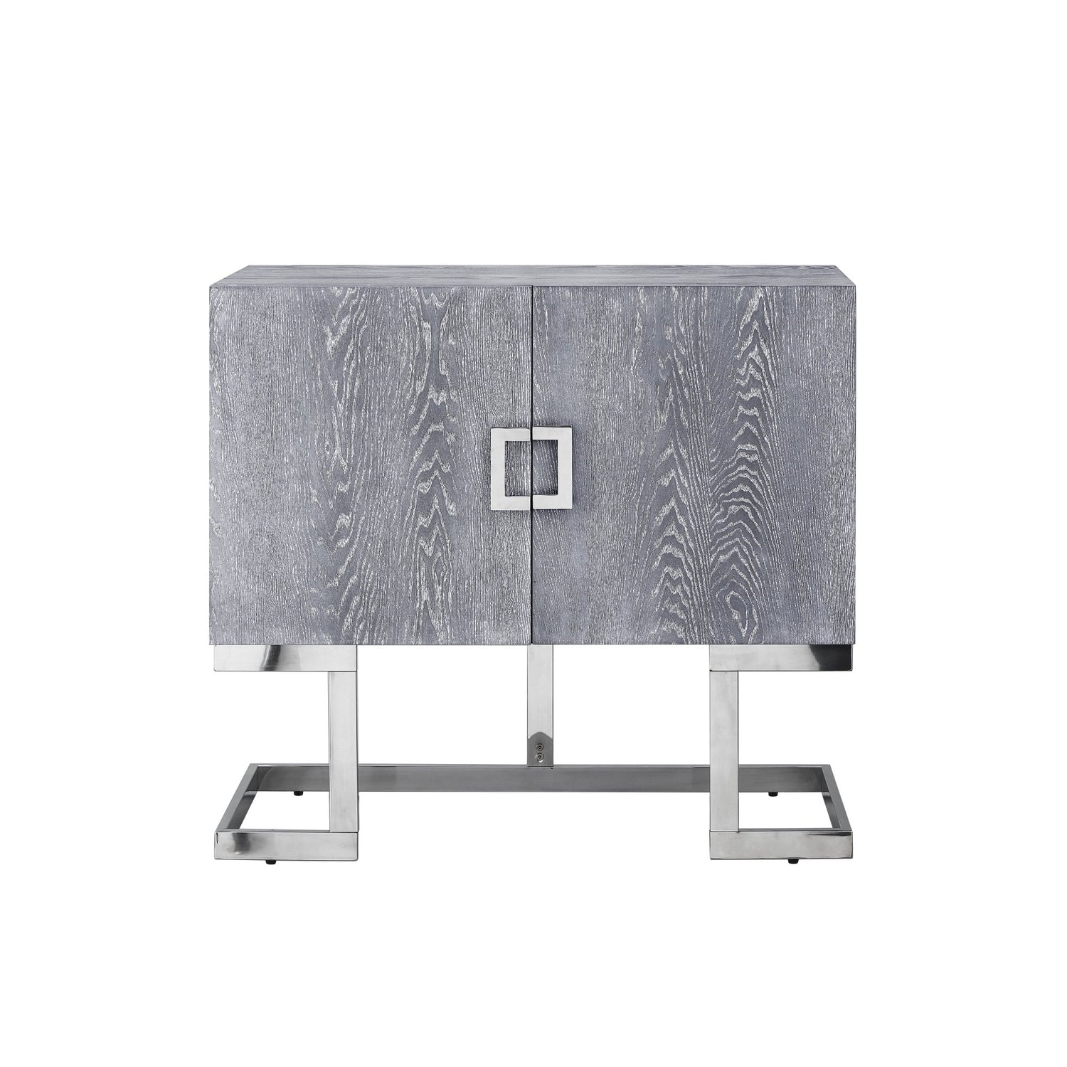 - ATTRIBUTES: 2 Doors, 2 Shelves, Veneer Finish, Polished Stainless Steel Base