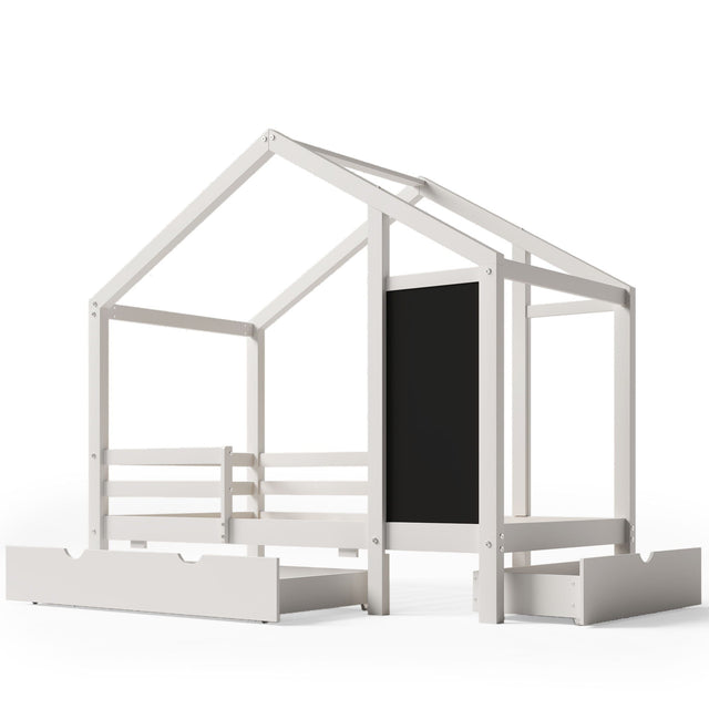 Twin House Bed With Blackboard And Drawers, 2 Assembly Options - White