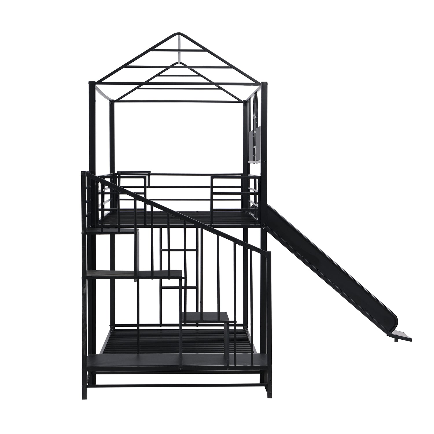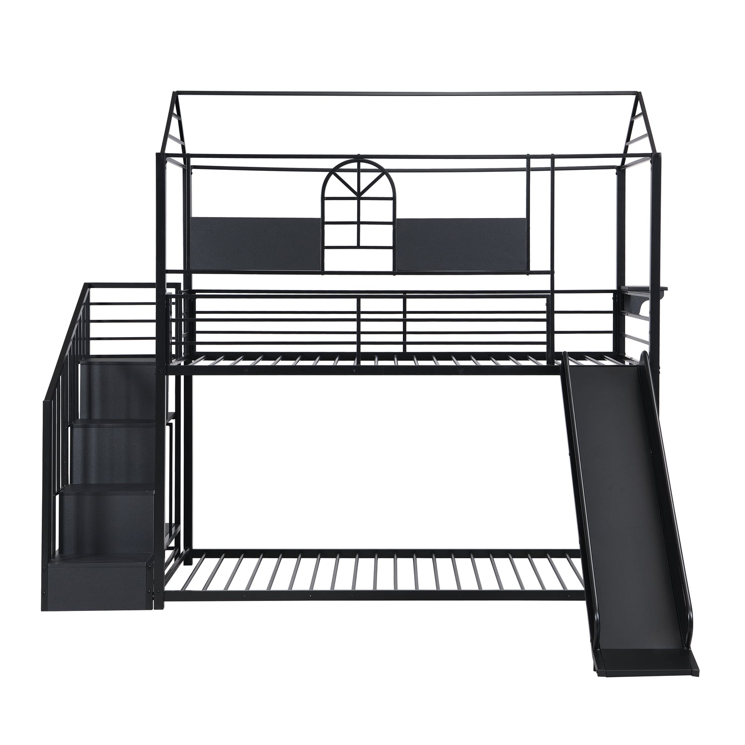Twin Over Twin Metal Bunk Bed With Slide And Steps - Black