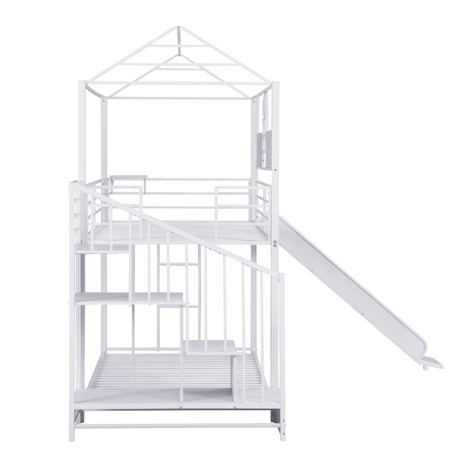 Twin Over Twin Metal Bunk Bed With Slide And Steps - White