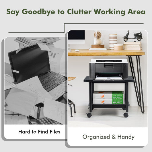 The 2-tier under desk printer stand will be a perfect choice in your office classroom and home. Made of heavy-duty steel pipes and thickened engineered wood the printer cart is sturdy enough to support different kinds of heavy office supplies. Bring the rolling printer stand to your home office and keep interior environment organized. Different kinds of office supplies can be placed on the board shelves to keep what you want within arm's reach while freeing up more work space. Bring the rolling printer stand to your home office so there is no need to transport printer supplies from one room to another room anymore.