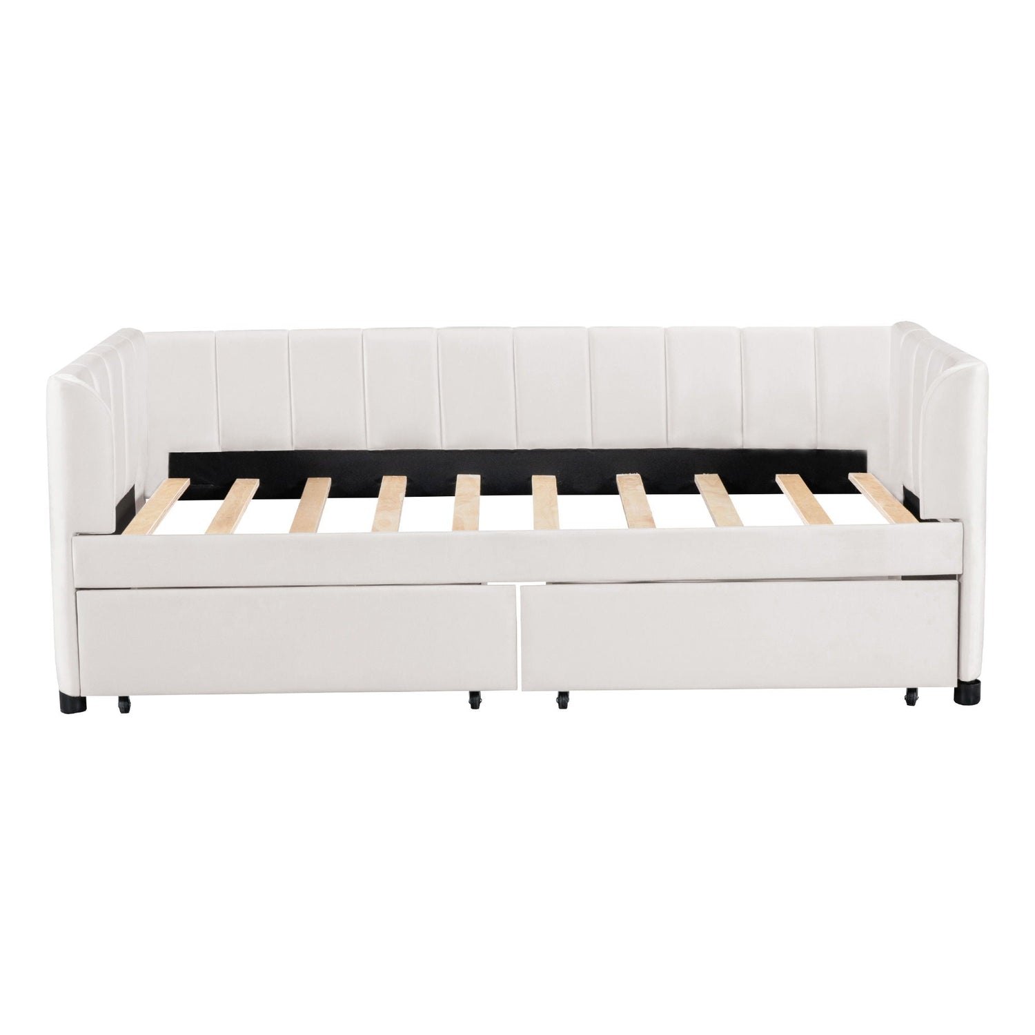 Upholstered Daybed With Ergonomic Design Backrest by Couch.com - Beige / Twin / 2 Drawers, Trundle is backordered and will ship as soon as it is back in stock.