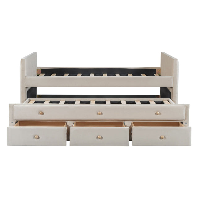Twin Size Upholstered Daybed With Twin Size Trundle And Drawers - Beige