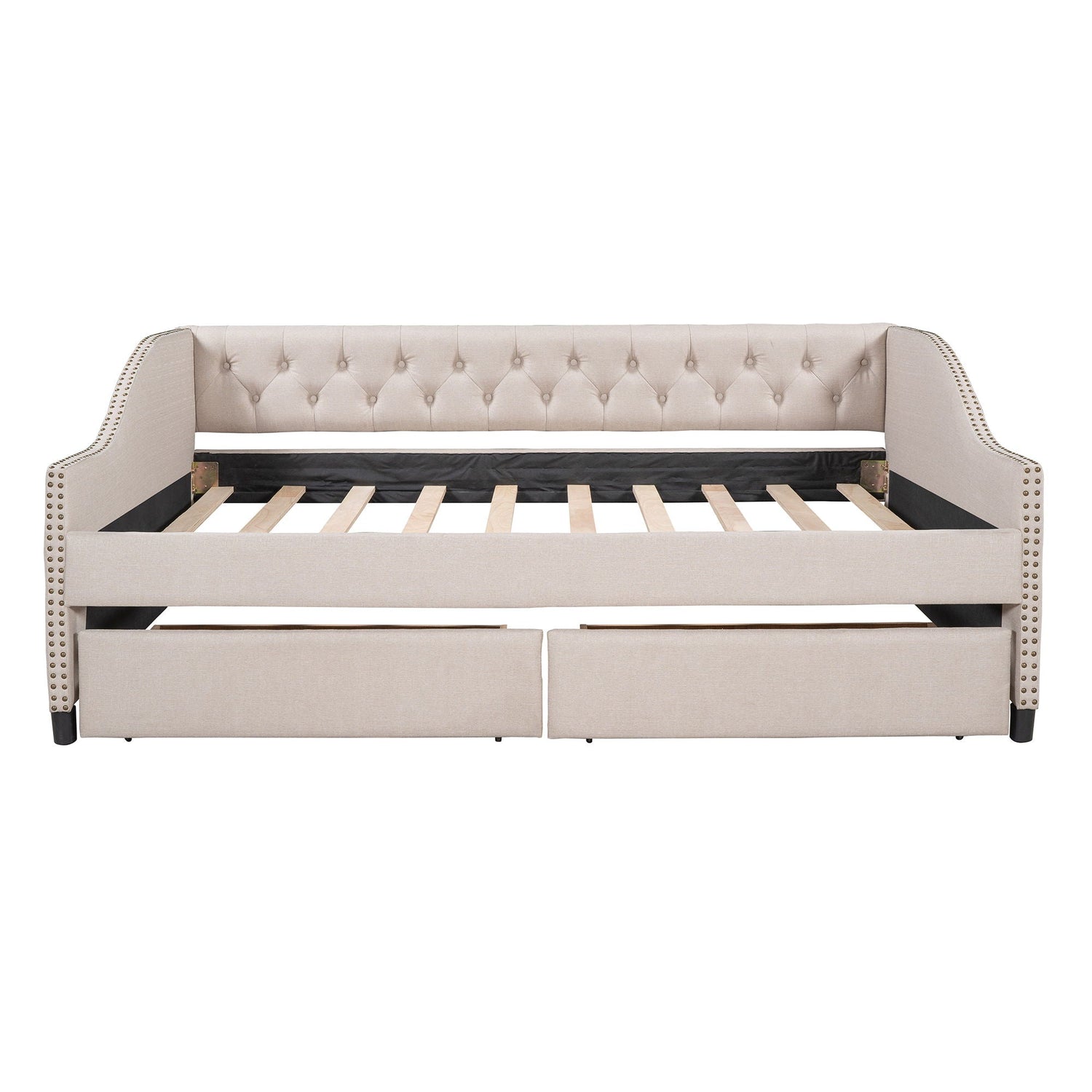 Full Size Upholstered Daybed With Two Drawers, Slat Support - Beige