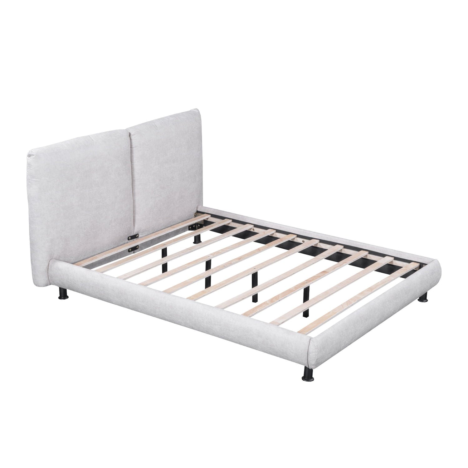 This beautiful upholstered platform bed adds a contemporary chic look to your bedroom and is upholstered in thick polyester fabric for extra comfort. Two large headrests at the headboard provide luxurious comfort and support for lounging, reading, or watching TV in bed. The sturdy wood frame construction and wooden slat system ensure stability and safety. Enjoy years of relaxation and family fun with this meticulously designed platform bed that serves as both a beautiful room centerpiece and a cozy family retreat.