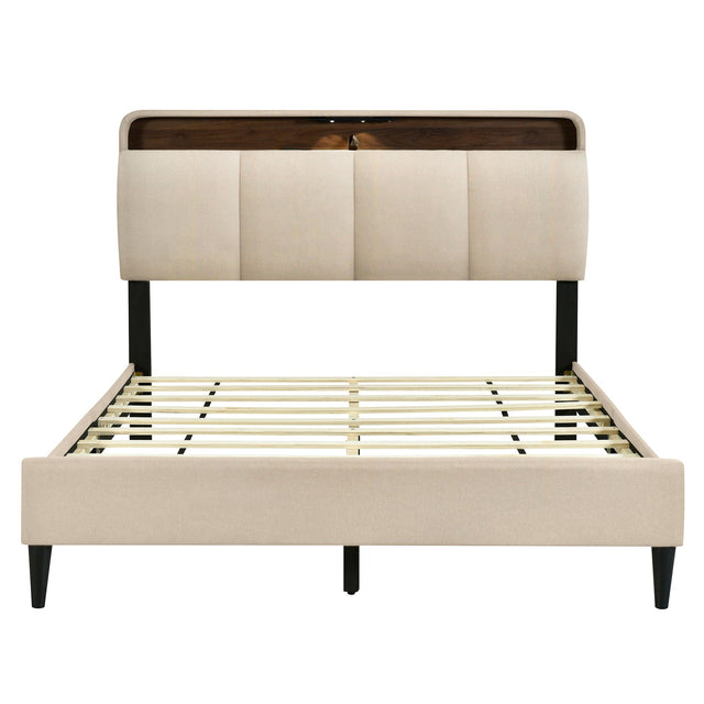 Queen Size Upholstered Platform Bed With Storage Headboard, Sensor Light And A Set Of Sockets And USB Ports - Beige