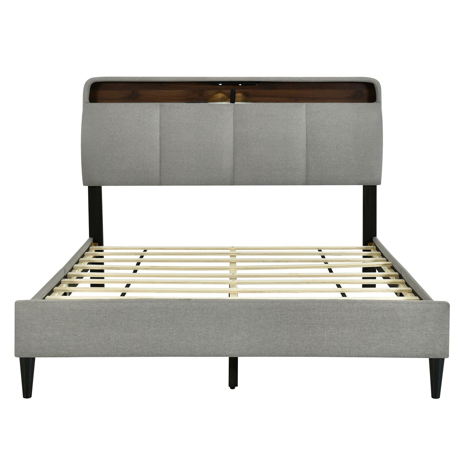 Queen Size Upholstered Platform Bed With Storage Headboard, Sensor Light And A Set Of Sockets And USB Ports - Gray