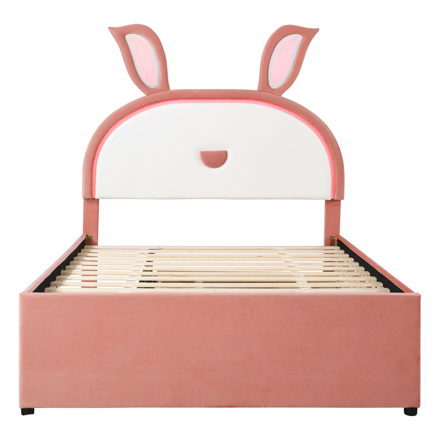 Upholstered Platform Bed With Trundle And 3 Drawers, Rabbit-Shaped Headboard With Embedded LED Lights by Couch.com - Pink / Full is backordered and will ship as soon as it is back in stock.