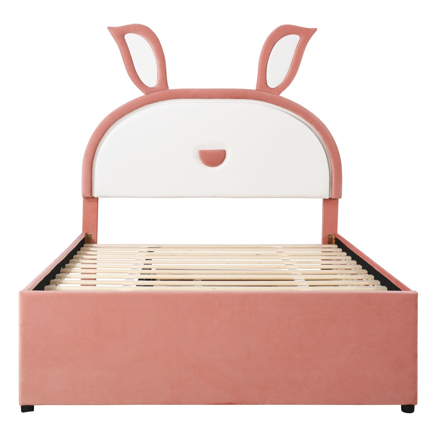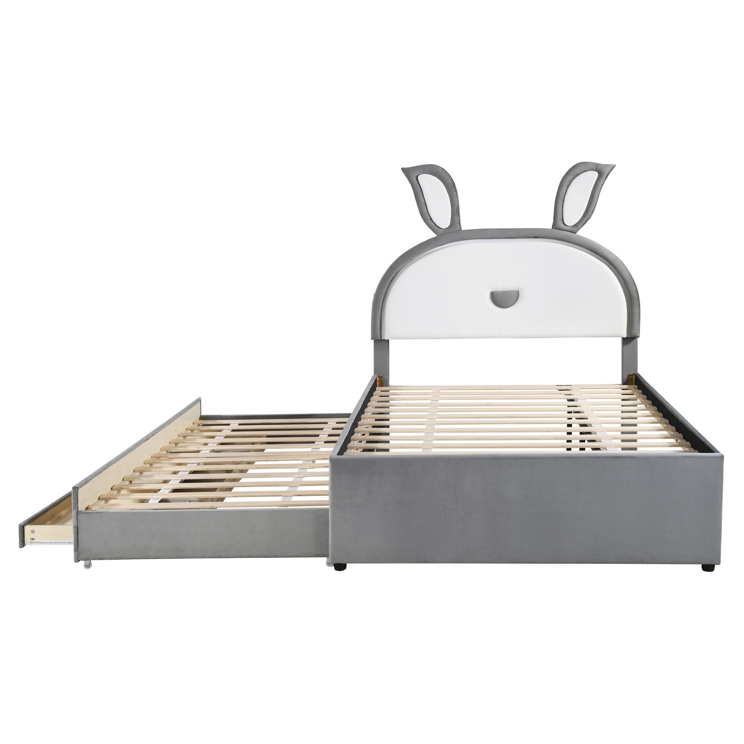 Velvet Platform Bed with Trundle and Drawers - a perfect blend of comfort, convenience, and style. The soft fabric upholstery, coupled with the charming rabbit-shaped headboard, creates a whimsical and inviting atmosphere, making bedtime a magical experience. The integrated trundle and drawers provide additional sleeping space and storage options, ensuring your bedroom remains tidy and organized. Crafted with a sturdy platform construction, this bed offers reliable support and durability for a restful night's sleep. Upgrade your bedroom with the Upholstered Platform Bed - where comfort meets style, and convenience meets sophistication. Create a space that reflects your personality and enhances your lifestyle with this exceptional piece of furniture.