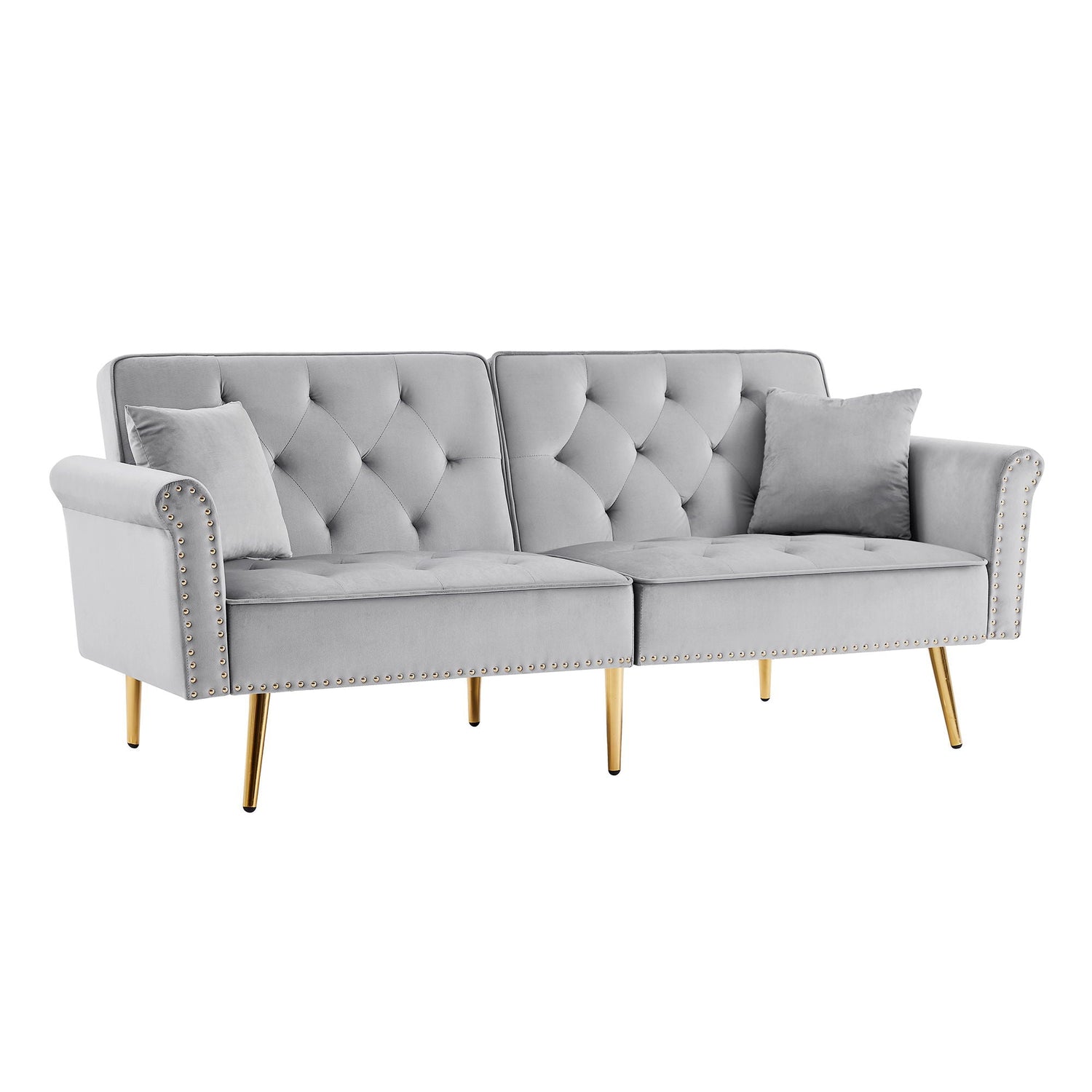 Velvet Tufted Sofa Couch With 2 Pillows And Nailhead Trim - Light Gray