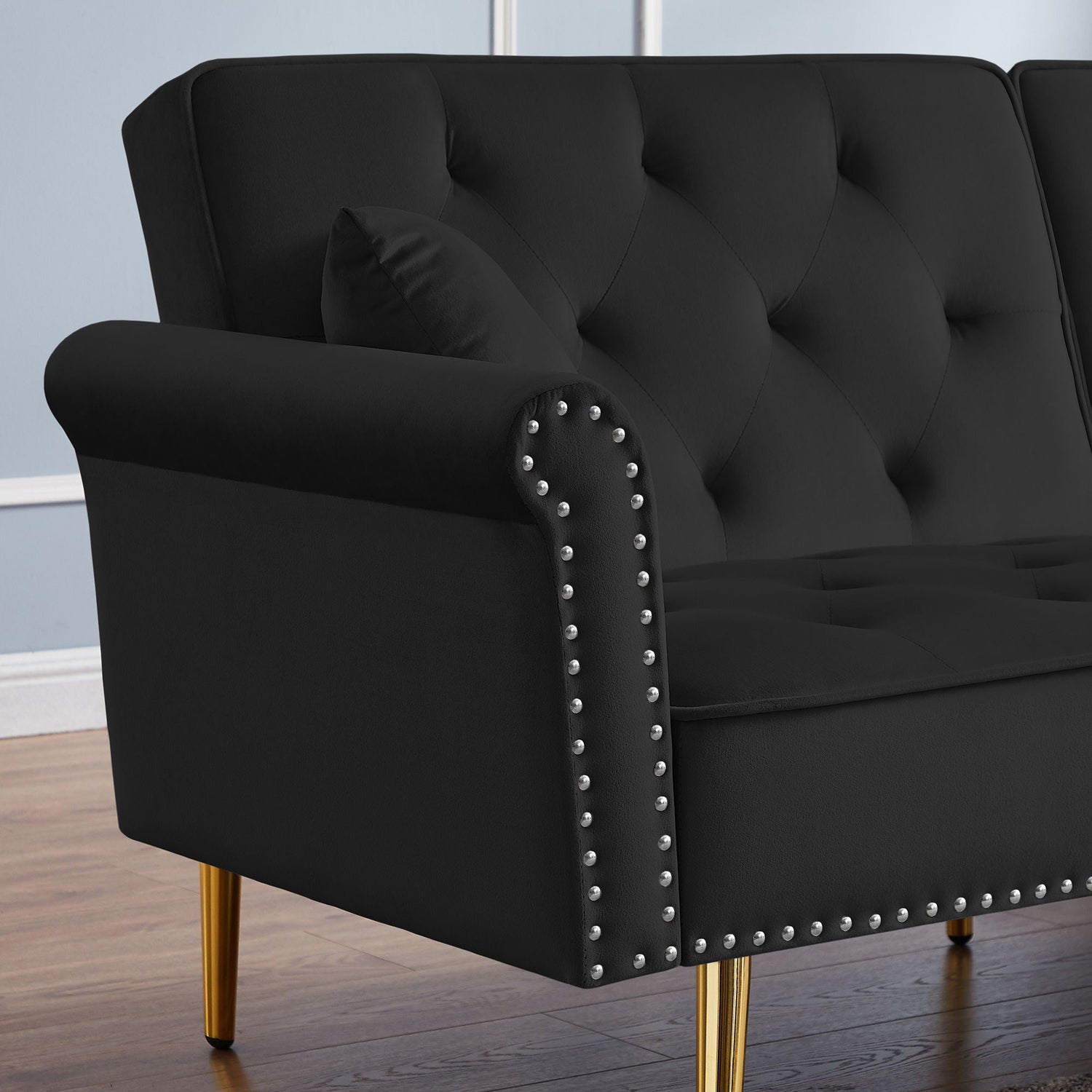 Velvet Tufted Sofa Couch With 2 Pillows And Nailhead Trim - Black