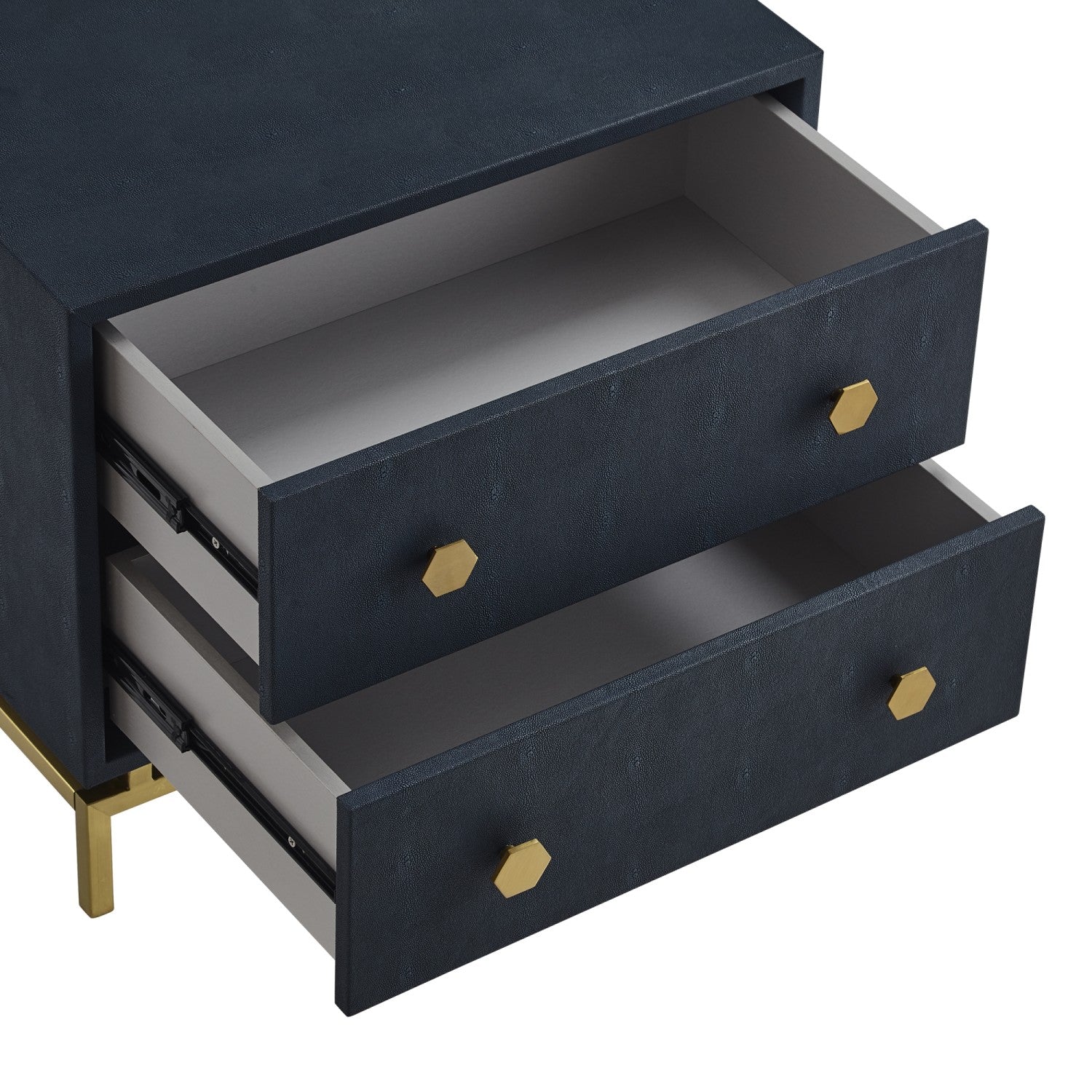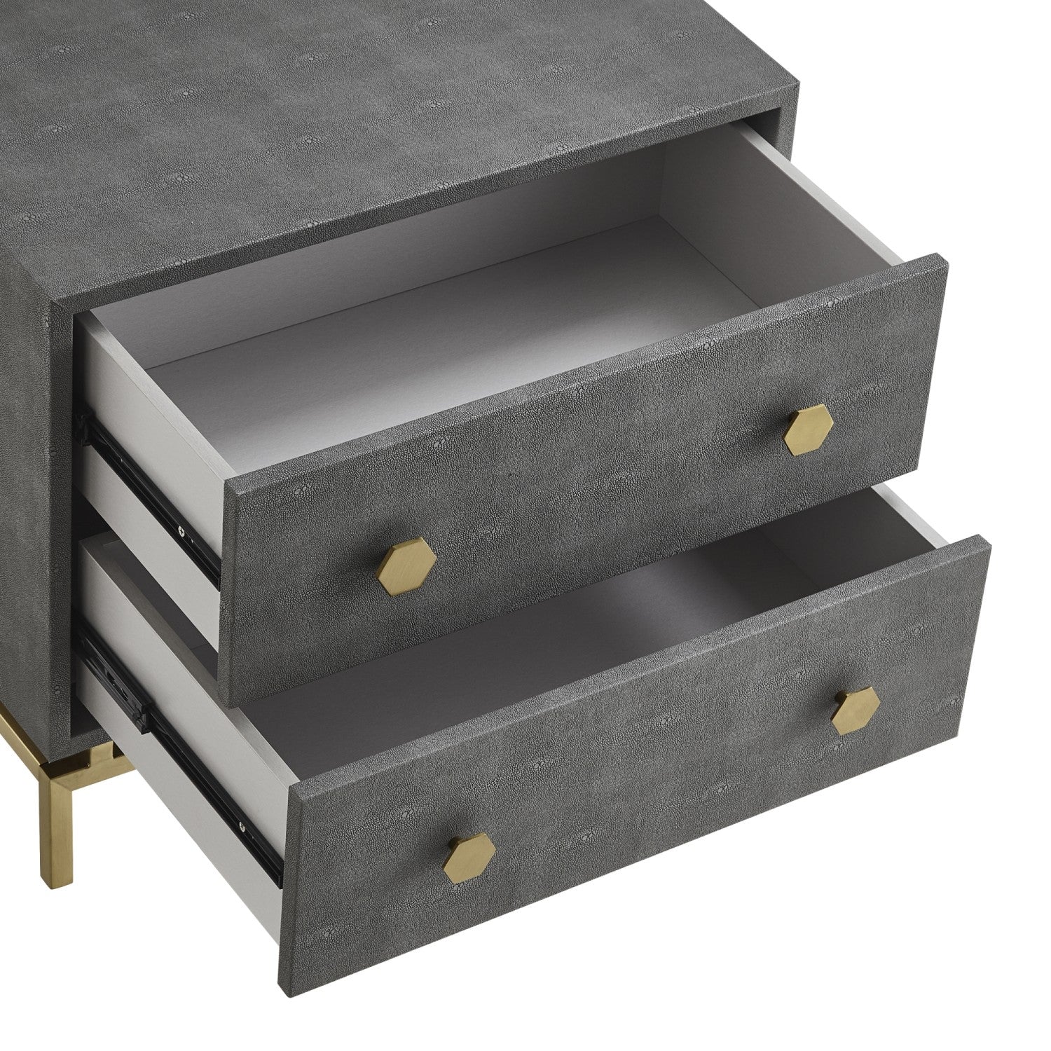 - FABRIC & MATERIALS: Faux Shagreen, MDF, Stainless Steel